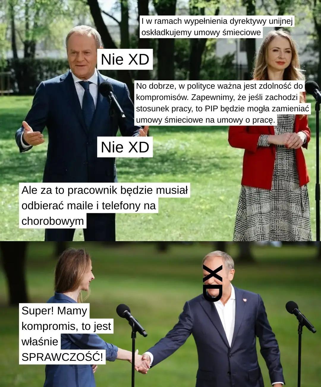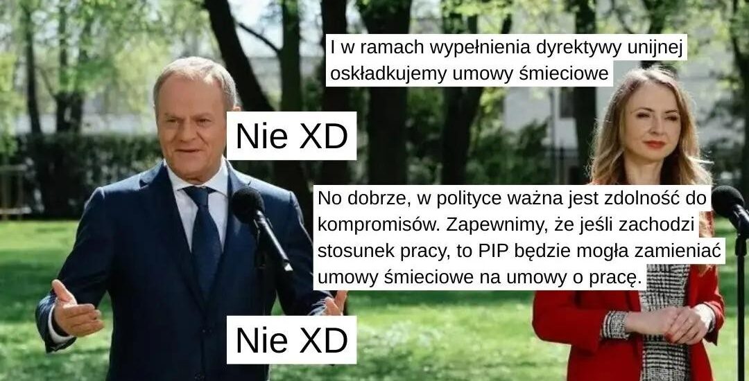 Most recently Donald Tusk simply binned Lewica’s bill on Labour Inspectorate, which aimed to tackle the plague of fake self-employment (employers in Poland regularly force their employees to become self-employed subcontractors in order to avoid respecting their worker’s rights, while higher paid workers such as coders and IT specialists do it on their own will as a “tax optimization” method). This had skyrocketed since 2008 when Donald Tusk – who was also in power back then – “temporary relaxed” the employment laws in order to help the economy during the credit crunch and Poland is currently amongst the worst offenders in that field in the EU – so much, that one of the condition for releasing money from recovering funds was for Poland to sort it out. Apparently though, neither the rights of the Polish workers or the expectation of his coalition partner matter for Donald Tusk as much, as the potential need of seeking new coalition partner after next elections. And radical right is very much against “over regulating of the work market”.